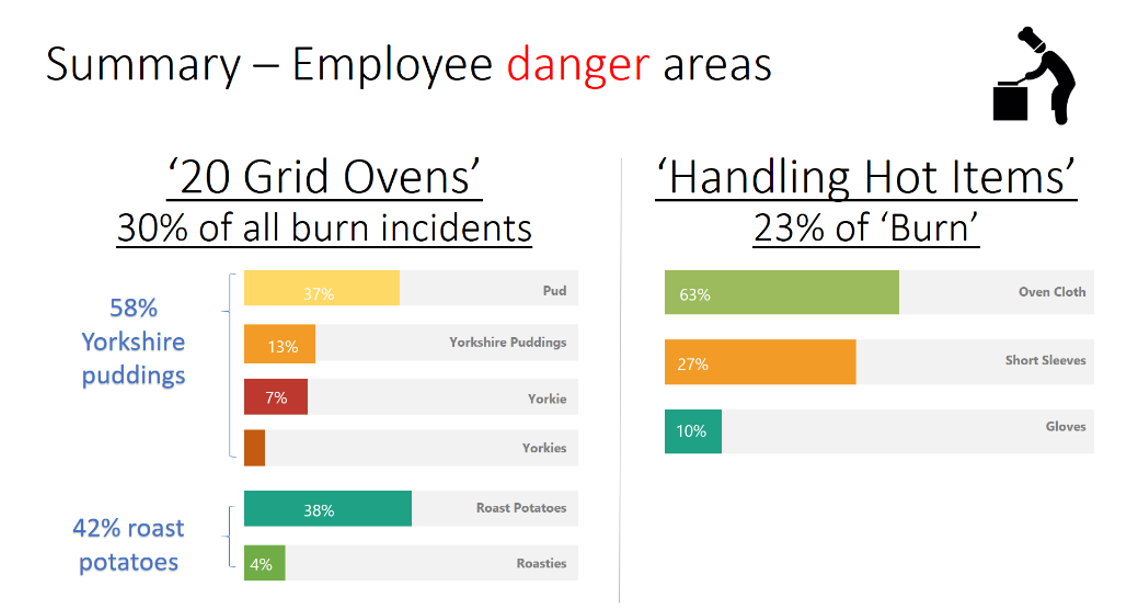 The SafetyScanner system not only visualised the split between hazard types, it also verified the quality of the data. Four types of categories (fall, cut, slip, ‘burn/scald’) statistically represented 63.7% of all the incidents, highlighting the areas to explore further and proving the ‘80/20’ pareto principle applies to safety challenges also.