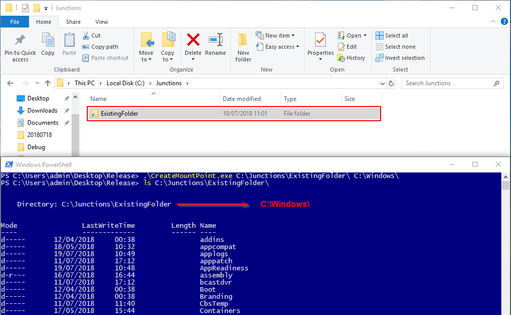 The permissions applied grant the ‘Everyone’ group full control over both folders, allowing any standard user to create a junction to an alternative folder. Thus, the ‘Everyone’ permission is placed on the junction folder, enforcing inheritance on each file or folder within this structure.