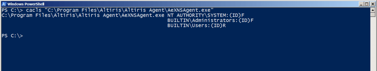 The following screenshots show the permissions applied to the ‘Altiris Agent’ folder and the AeNXSAgent.exe service binary, before modifying the mount point to overwrite the permissions: