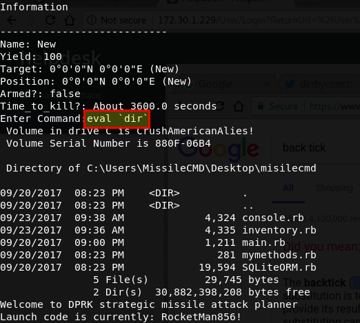 From the help command, we thought that that it might be Ruby command injection. After chatting with the SwAG team after the end of the CTF, we learned that this was correct and it was a case of finding the correct spot to inject Ruby commands. Props to SwAG and other teams for getting this one, and thanks to the DerbyCon CTF organisers for allowing us to grab some screenshots after the competition had finished in order to share this with you. We’ll share what we know about this box, but wish to make it clear that we failed to root it during the competition.