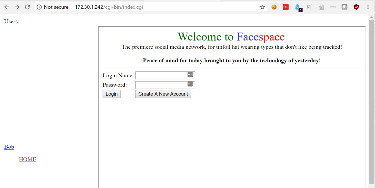 Navigating to this box, we found a new social media application that calls itself “The premiere social media network, for tinfoil hat wearing types”. We saw see that it was possible to create an account and login. Further, on the left hand side of the page it was possible to view profiles for those who had already created an account.