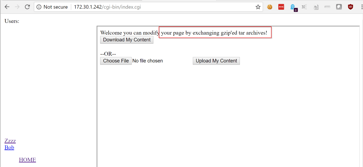 Once we had created an account and logged in, we were redirected to the page shown below. Interestingly it allowed you to upload tar.gz files, and tar files have some interesting properties… By playing around with the site, we confirmed tar files that were uploaded were indeed untar’d and the files written out to the /users/ path.