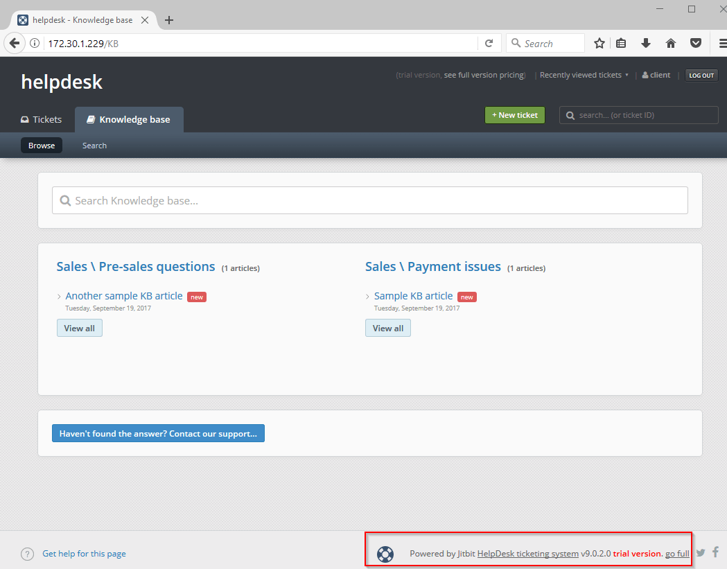 Awesome – we have a 0day to go after. Upon browsing to the .299 website, we were redirected to the /KB page. We had useful information in terms of vendor and a version number, as highlighted below.