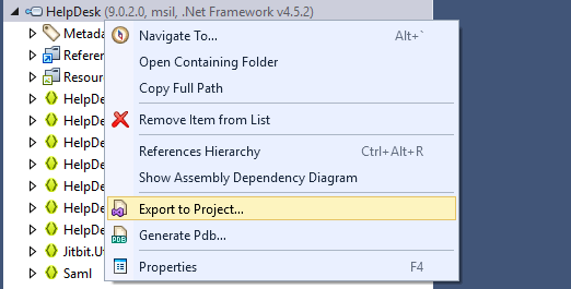 By loading the main HelpDesk.dll into dotPeek, we are able to extract all the source from the .dll by right clicking and hitting export to Project. This drops all the source code that is able to be extracted into a folder of your choosing.