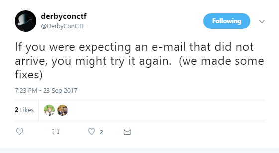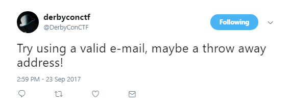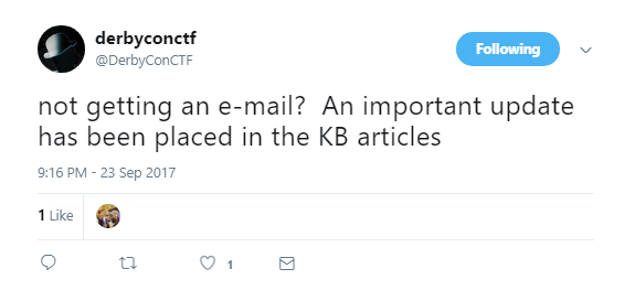 We hadn’t really looked too much at this box until the tweet below came out. A good tip for the DerbyCon CTF (and others) is to make sure that you have alerts on for the appropriate Twitter account or whatever other form of communication the organizers may decide to use.