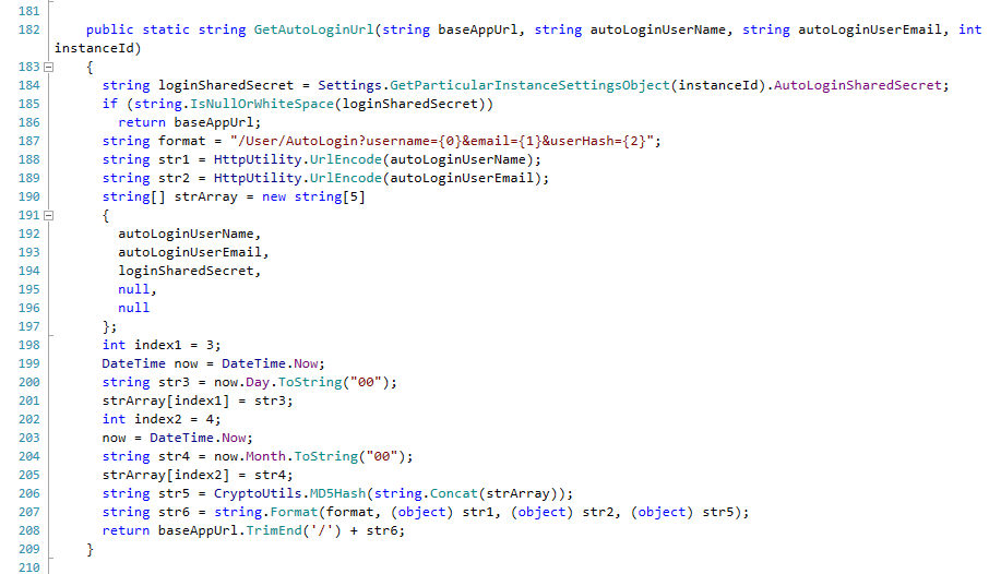 At this point we began looking into the how the URL was generated and located the function GetAutoLoginUrl() which was within the HelpDesk.BusinessLayer.VariousUtils class. The source of this is shown below.