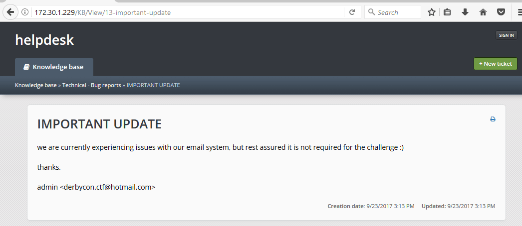 The KB article leaked the username and email address of the admin user. Interesting, although it was possible to obtain the email address from the sender and, well, the username was admin…