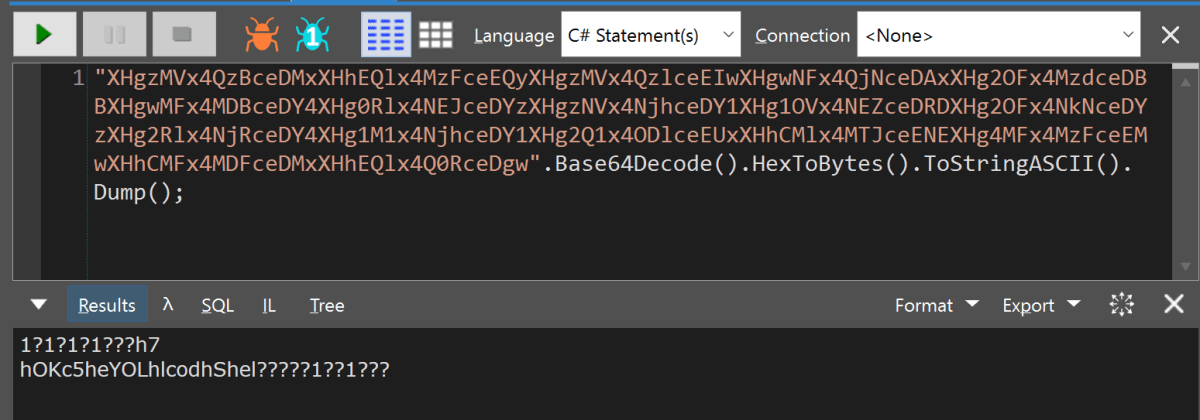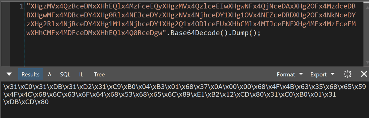 Using our favourite Swiss army tool of choice, LinqPad (https://www.linqpad.net/ – we promise we don’t work for them!), to Base64 decode the data-uri string, we saw that this was clearly an escape sequence. Decoding further into ASCII, we had a big clue – that looks a lot like shellcode in there.
