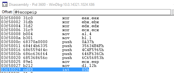 One point that is important to note is that when making a system call in Linux, values are passed through from user land to the kernel via registers. EAX contains the system call number then EBX, ECX, EDX, ESX and EDI take the parameters to the call in that order. The shellcode translates as follows. XORing a register with itself is used as a quick way to zero out a register.