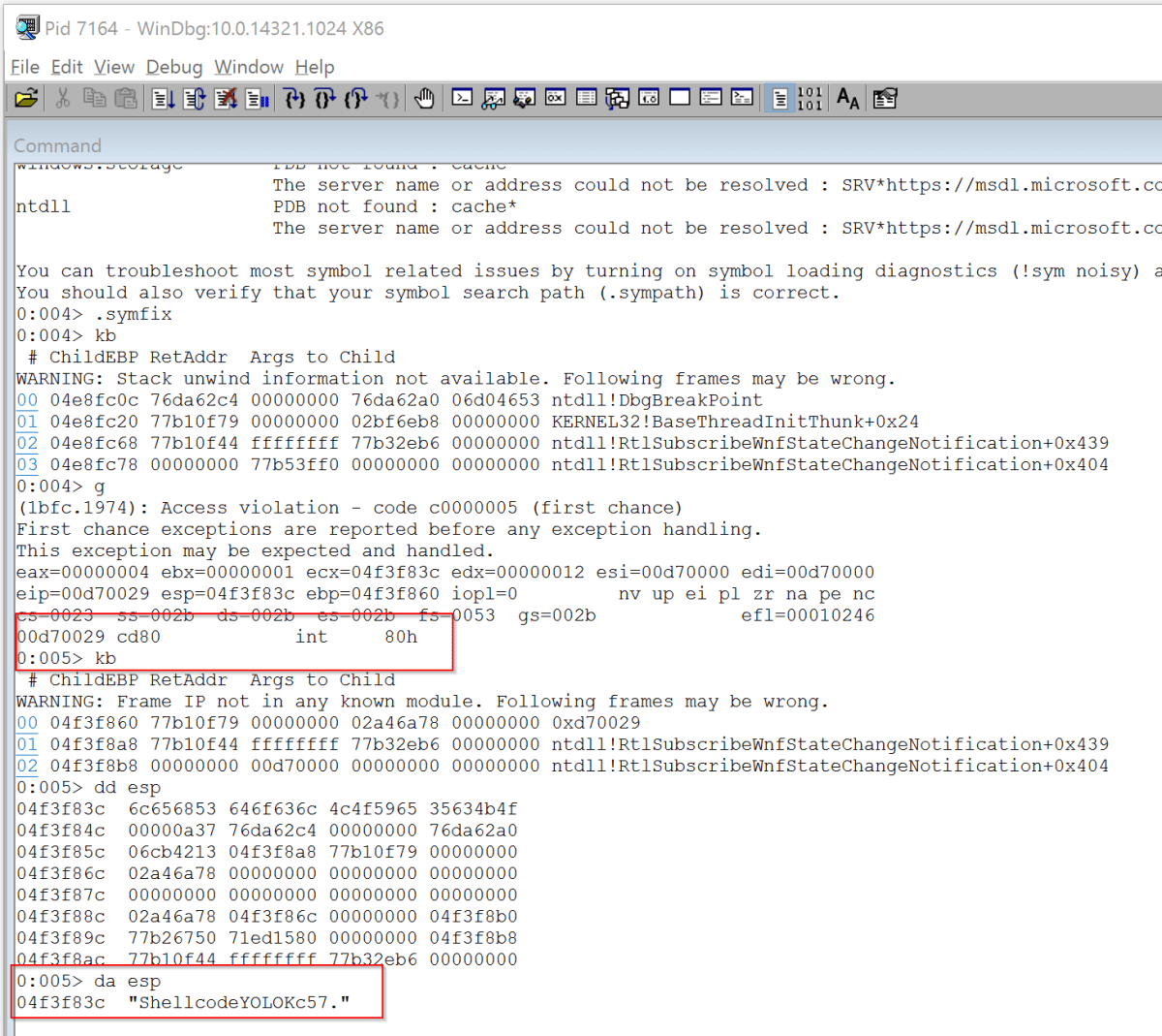 Attaching to the process with WinDbg and hitting go in LinqPad, the int 80 was triggered, which fired an Access Violation within WinDbg. This exception was then caught, allowing us to examine memory.