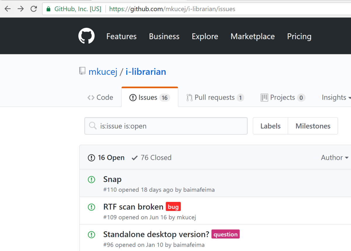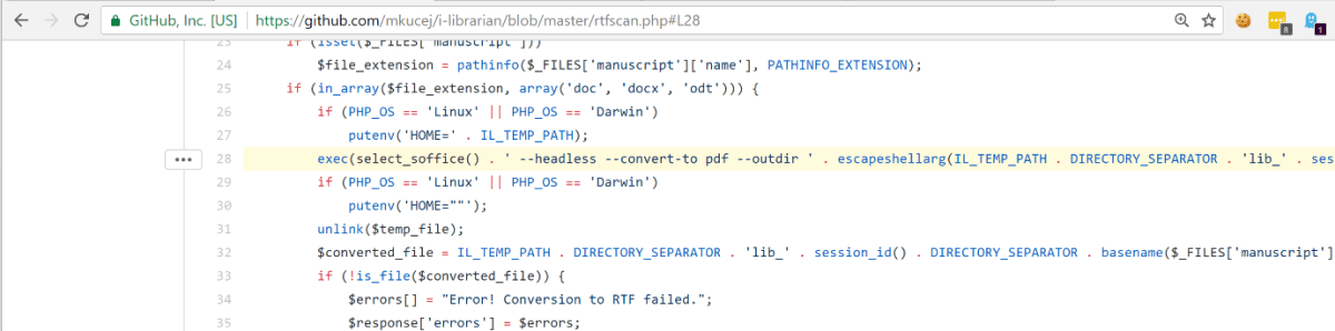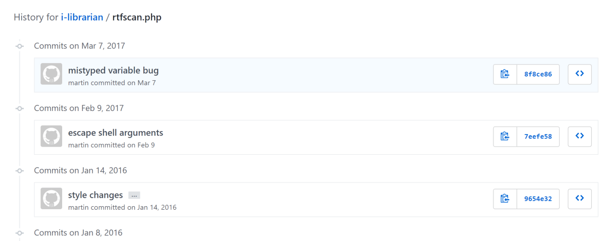 A good source of information about recent changes to a project is the issues tab on GitHub. Sometimes, security issues will be listed. As shown below, on the iLibrarian GitHub site one of the first issues listed was “RTF Scan Broken”. Interesting title; let’s dig a little further.