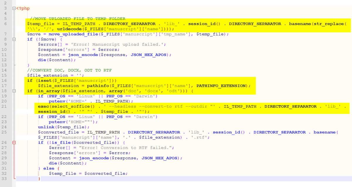 Firstly a variable called $temp_file is created. This is set to the current temporary path plus the value of the filename that passed during the upload of the manuscript file (manuscript is the name of the form variable). The file extension is then obtained from the $temp_file variable and if it is either doc, docx or odt, the file is then converted.
