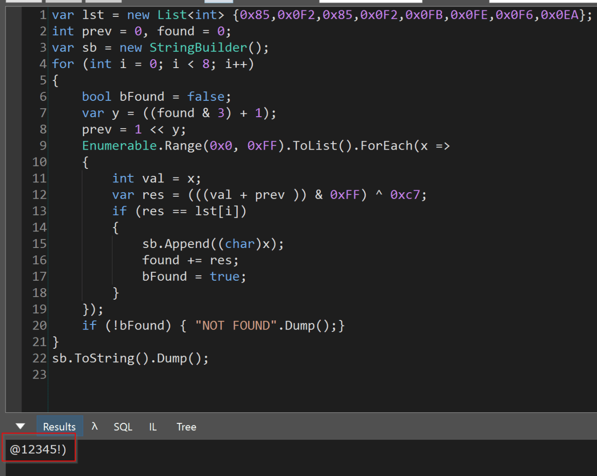 In order to recover the key, the following C# was written in (you guessed it!) LinqPad (https://www.linqpad.net/).