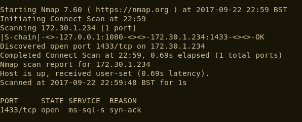 A quick port scan from our laptops indicated that this server was live, but had no ports open. However, the server was in scope so there must be a way to access it. We assumed that there was some network segregation in place, so we used the initial server as a pivot point to forward traffic.