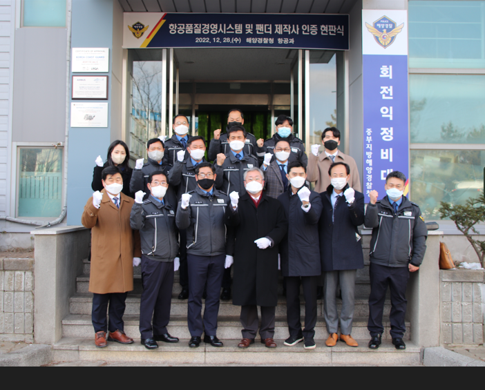 지난 29일,  인천 해양경찰청에서 로이드인증원(LRQA) 이일형 대표이사, 해양결창청 정봉훈 청장님 및 관련 실무자들이 자리한 가운데, 항공 품질 경영시스템인 AS 9110 인증 획득을 축하하는 인증 수여식을 진행하였습니다.
