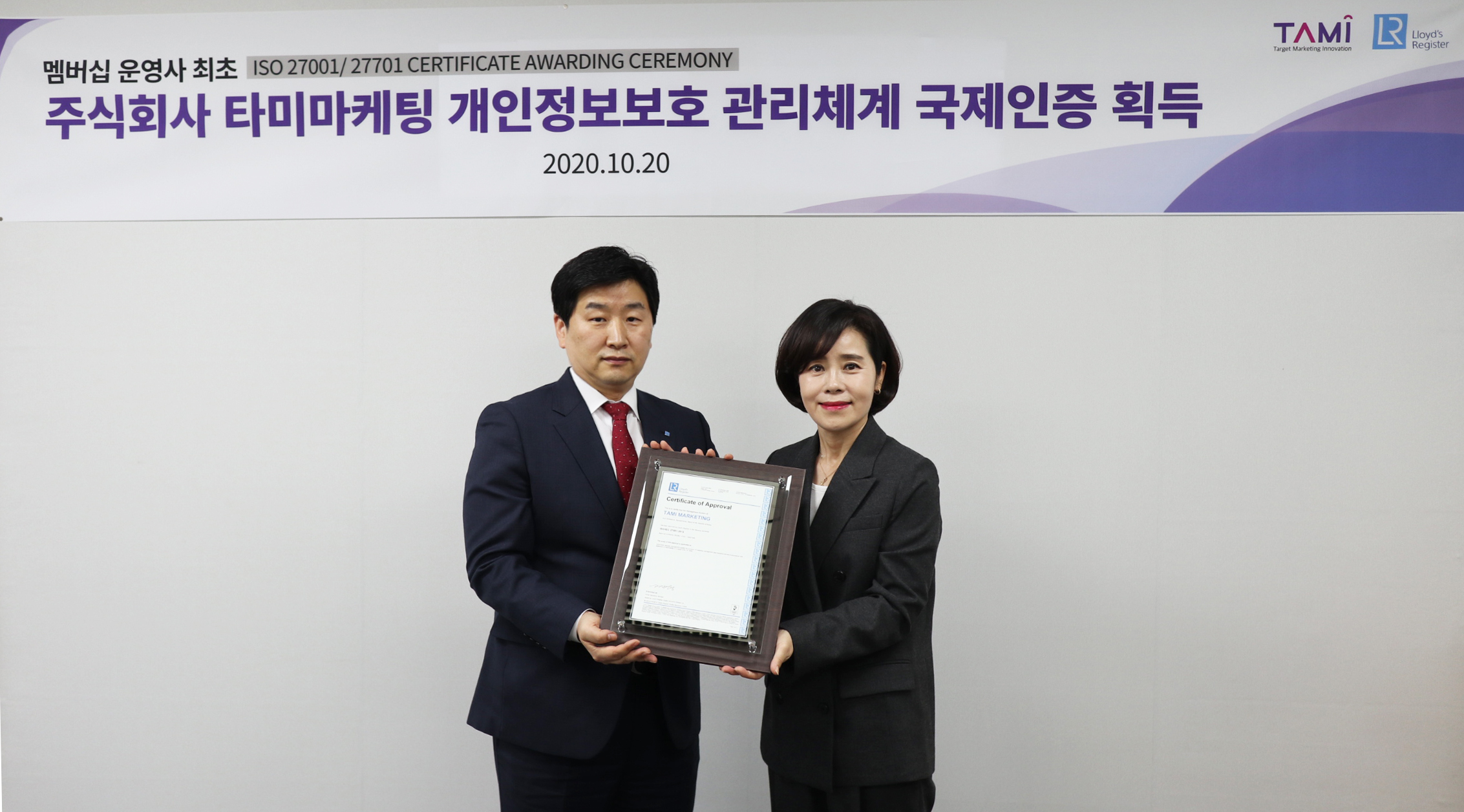 지난 10월 20일, VIP 마케팅 전문 기업 타미마케팅ISO 27001 및 ISO 27701 동시 인증 취득을 기념하기 위한 인증수여식이 타미마케팅 본사에서 진행되었습니다.