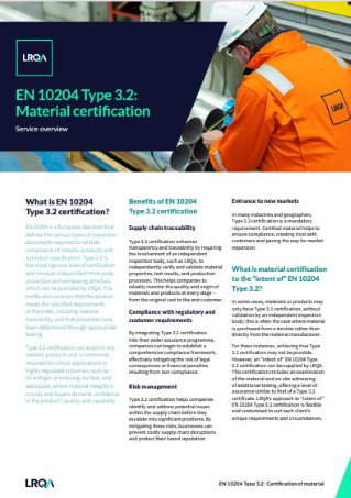 In this factsheet, you will get an understanding into what EN 10204 Type 3.2 inspection certification is, the benefits to becoming certified and guidance on how LRQA can support you.
